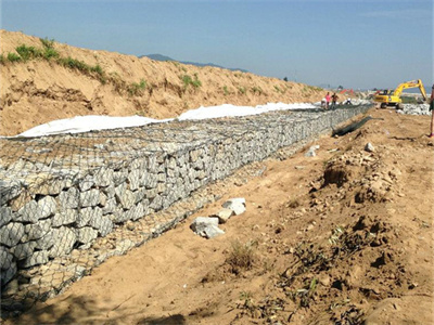 石籠網(wǎng)箱在施工現(xiàn)場經(jīng)石頭填充,構(gòu)成具有柔性、透水性及整體性的結(jié)構(gòu),如擋墻、河道襯砌、堰等支擋的防沖蝕工程。石籠網(wǎng)箱由間隔1米的隔板(雙絞合六邊形金屬網(wǎng)片)分成若干單元格,為了加強(qiáng)石籠網(wǎng)箱結(jié)構(gòu)的強(qiáng)度,面網(wǎng)板邊端均采用直徑更粗的鋼絲??刂坪鸵龑?dǎo)河流及洪水泄洪壩、導(dǎo)流壩巖崩防護(hù)、大橋保護(hù)、固土結(jié)構(gòu)、海濱防御工程、港口工程和擋土墻道路防護(hù)。