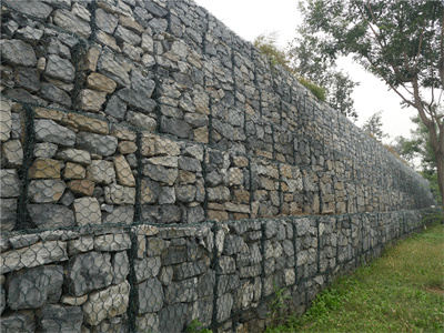 石籠網(wǎng)箱在施工現(xiàn)場經(jīng)石頭填充,構(gòu)成具有柔性、透水性及整體性的結(jié)構(gòu),如擋墻、河道襯砌、堰等支擋的防沖蝕工程。石籠網(wǎng)箱由間隔1米的隔板(雙絞合六邊形金屬網(wǎng)片)分成若干單元格,為了加強(qiáng)石籠網(wǎng)箱結(jié)構(gòu)的強(qiáng)度,面網(wǎng)板邊端均采用直徑更粗的鋼絲??刂坪鸵龑?dǎo)河流及洪水泄洪壩、導(dǎo)流壩巖崩防護(hù)、大橋保護(hù)、固土結(jié)構(gòu)、海濱防御工程、港口工程和擋土墻道路防護(hù)。